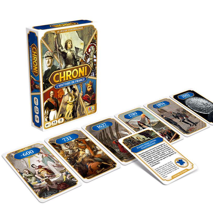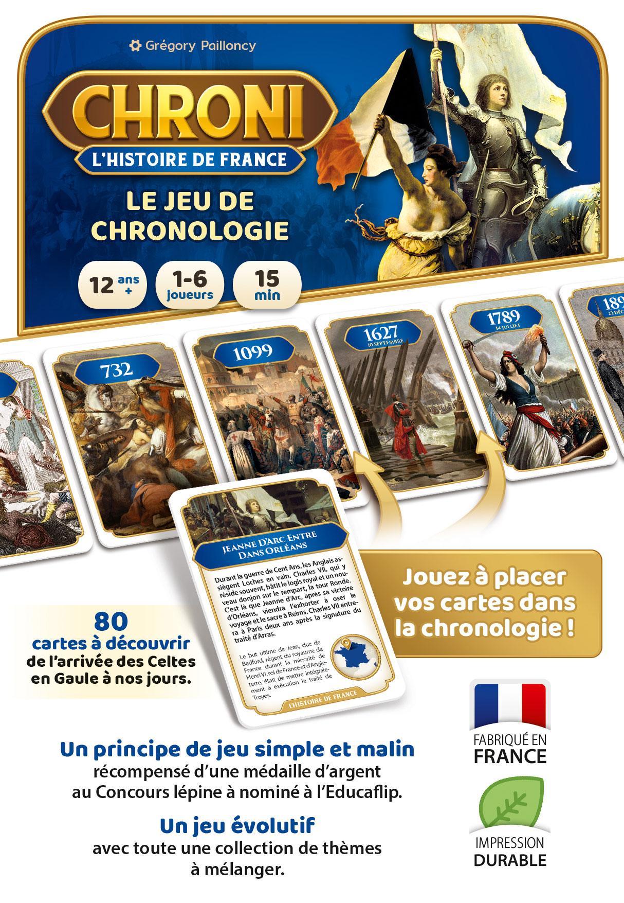 Chroni – L’histoire de France est un jeu d’apprentissage avec auquel on s’amuse à mémoriser progressivement et durablement les grandes dates.Idéal pour les curieux qui souhaitent découvrir ou redécouvrir l’Histoire en toute ou simplicité ou les amateurs qui veulent consolider leurs connaissances.