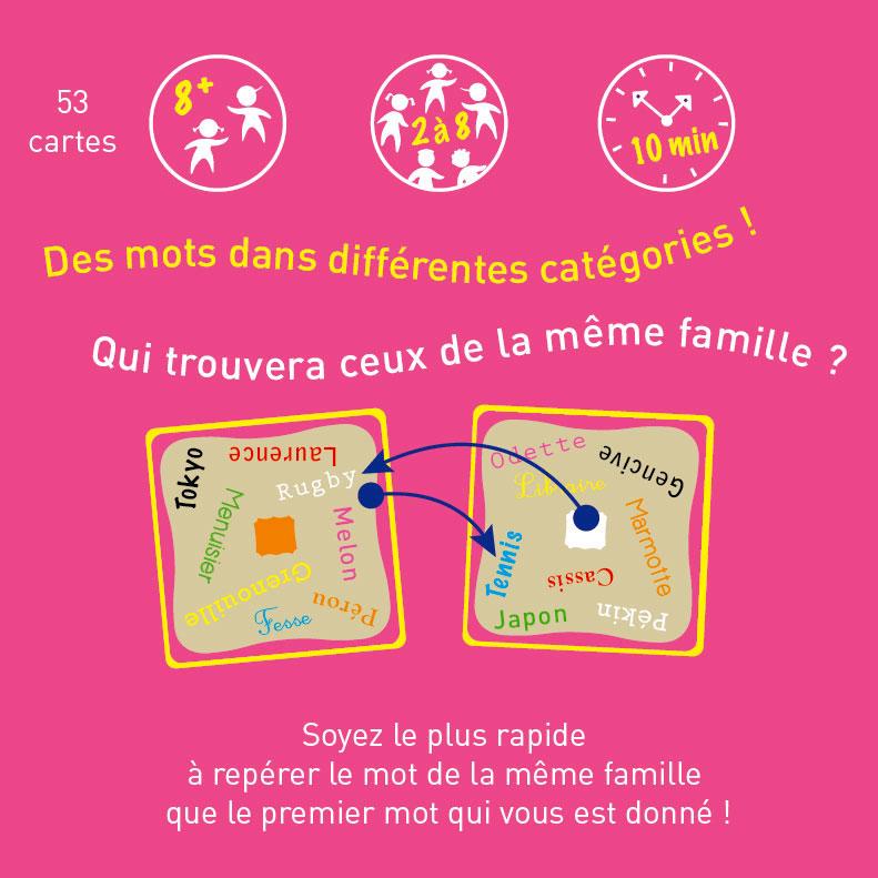 Grâce à un code couleur, les joueurs doivent trouver un mot au recto et trouver le mot de la même famille au verso.